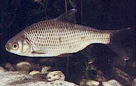 Der Rotauge, ist ein zur Familie der Karpfen gehörender Fisch. Er ist auf dem Rücken graugrün, an den Seiten gelblich, an den Bauch-, After- und Schwanzflossen blutrot gefärbt. Die goldgelbe Iris des Auges trägt einen roten Punkt. Der Fisch ähnelt sehr der Plötze, die auch dieselben Namen wie das Rotauge trägt; er wird 20-30 cm lang und 0,5-0,8 kg schwer. |