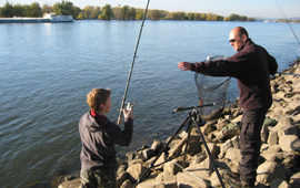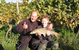| Geschafft - die erste Barbe ist gefangen | Jens mit Benni und seiner Barbe | |||